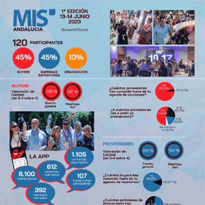 MIS Andalucía Ediciones Buyers Proveedores ¡Más de 600 reuniones realizadas en la 1ª edición del MIS Andalucía! Infografía [+] Álbum de Fotos [+] Informe Post – Evento [+] Sponsor Destino oficial 2023 Colaboradores 2023